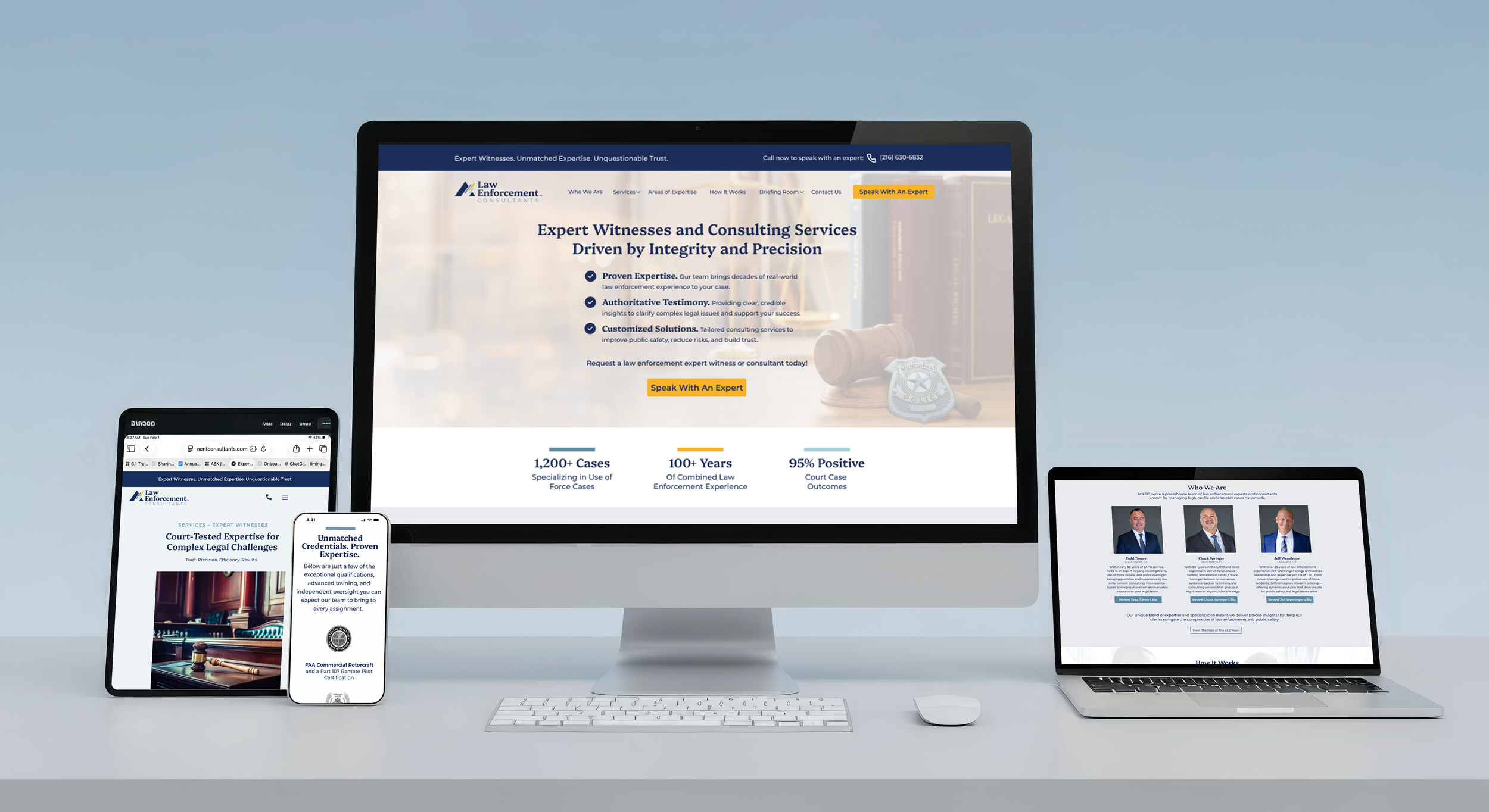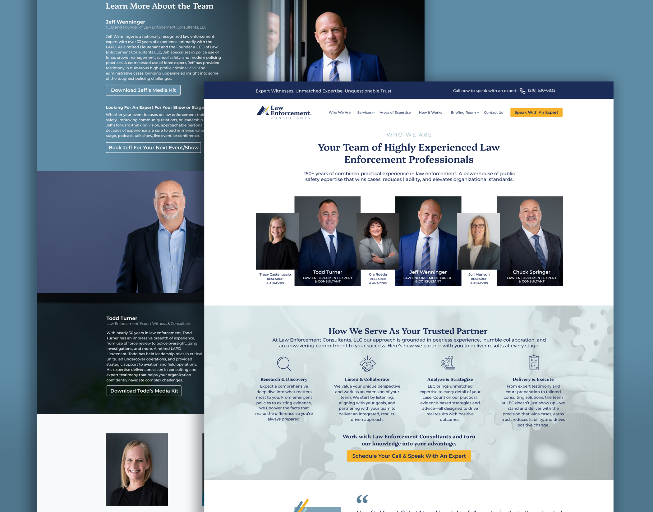 The founder, Jeff Wenninger and his team of powerhouse law enforcement experts and consultants had already consulted in over 1,200 use of force cases and had 100+ years of combined experience in the law enforcement industry. But with no real strategy or brand to communicate their expertise and how they could help their clients, they were just isolated experts spread across the US, going unnoticed and underutilized. They needed a brand strategy, visual identity and professional online presence that educated and communicated their services, showing them as the expert team they were and giving their clients an easy way to understand how their expertise could help their case.